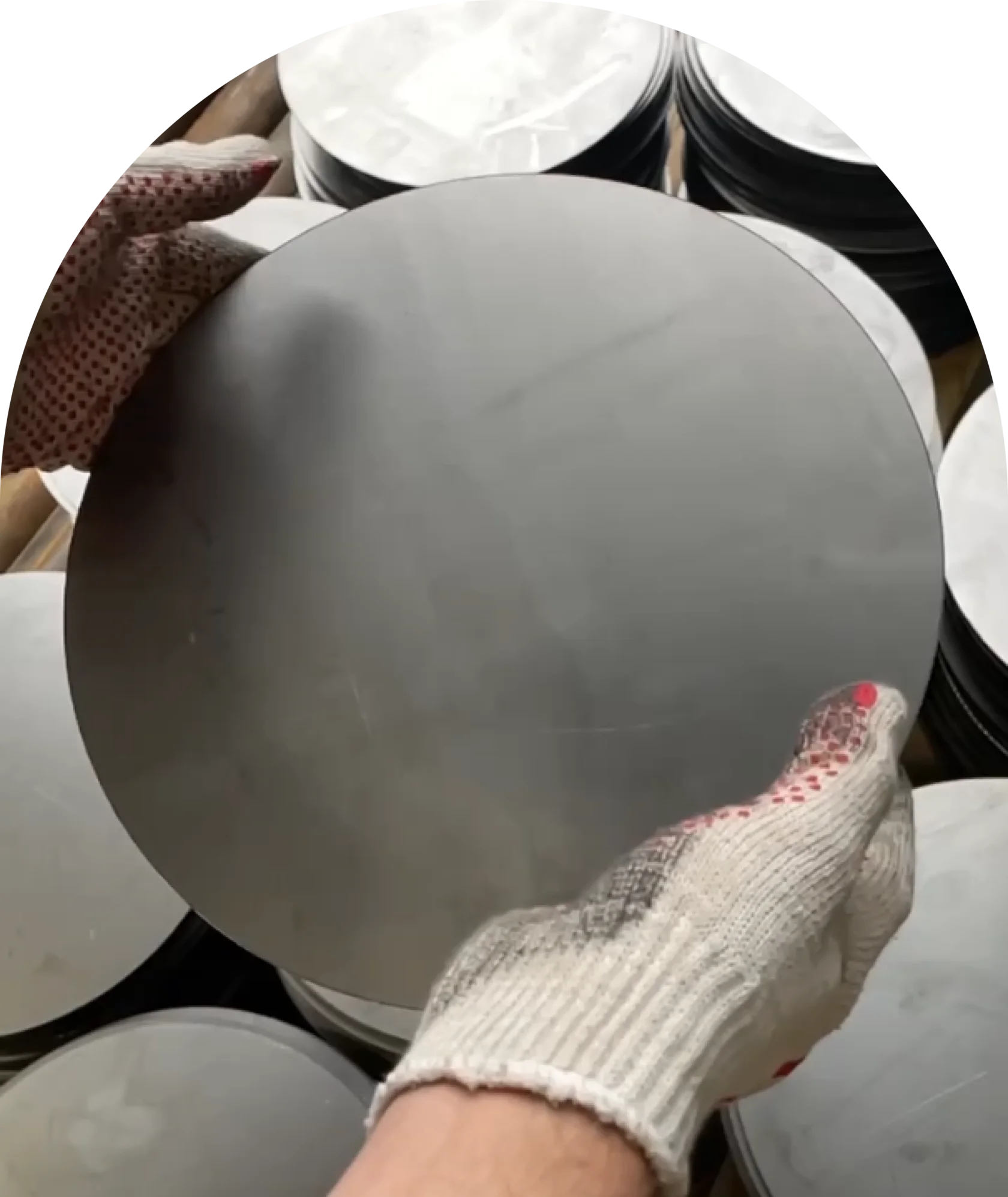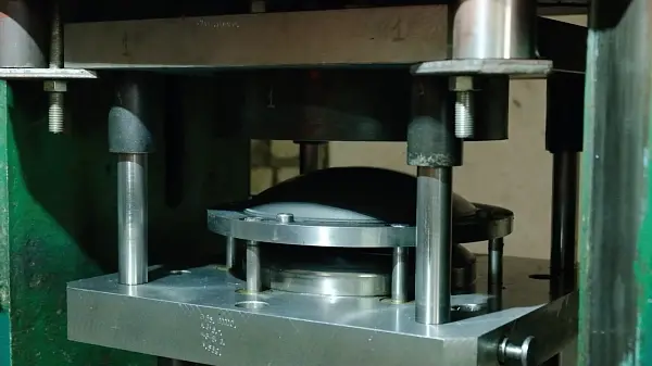 Once cut, the circles are sent to a special room with hydraulic press. Here, purpose-built equipment, under pressure, turns the circles into semi-spheres.
