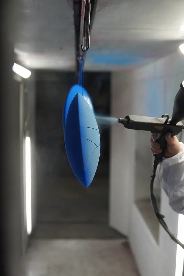 Next, we hand-paint the drums with powder coating and bake them in the furnace for 20 minutes at 200 degrees.
